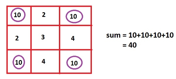 給出大小為 2X2 的陣列,目標是列印儲存在陣列中的所有角元素的總和。