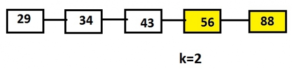 例如,連結串列包含節點29、34、43、56和88,k的值為2,則輸出將是最後的k個節點,即56和88。