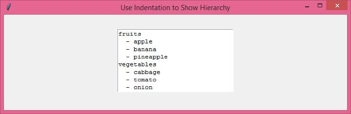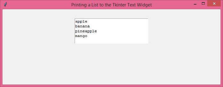 擁有 Text 控制元件後,我們可以將專案列表列印到其中。最簡單的方法是使用 for 迴圈遍歷列表,並使用 Text 控制元件的 **insert()** 方法將每個專案新增到新行。以下是將水果名稱列表列印到 Text 控制元件的示例程式碼: