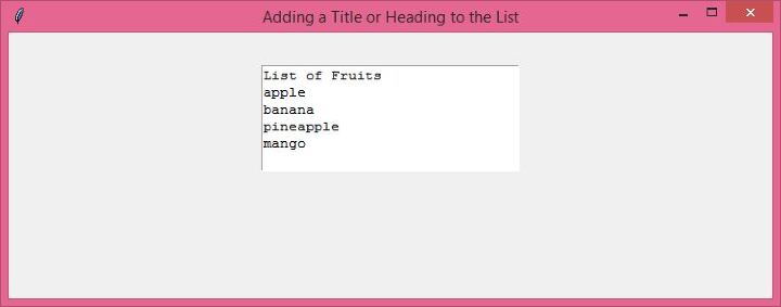 如果您要列印的專案列表具有特定的含義或用途,您可能希望向 Text 控制元件新增標題或標題,以便使用者清楚地瞭解其含義。您可以使用 insert() 方法在列表本身之前向控制元件頂部新增一行文字。以下是一個示例: