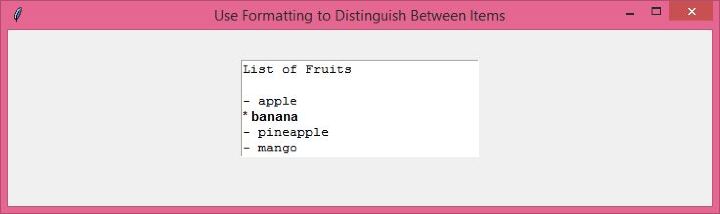 在此示例中,我們使用“*”字元在單詞“banana”前面新增一個專案符號,並使用自定義粗體標籤對其進行格式化。我們在程式碼底部使用 tag_configure() 方法定義標籤,該方法指定字型樣式和粗細。