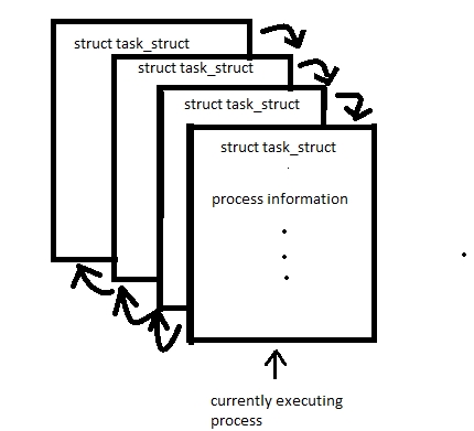 Linux 核心中,所有活動程序都使用 task struct 的雙向連結串列表示。核心對當前在系統上執行的程序維持一個指標 -current-,如下所示 −
