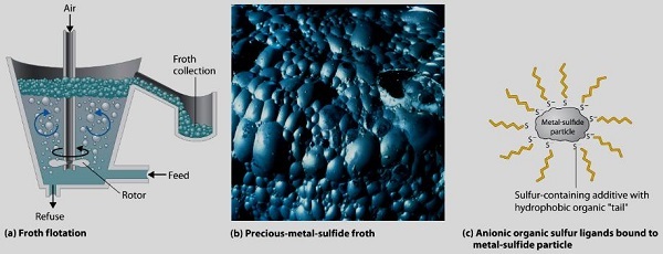 最後一種物理方法是浮選,其中將破碎的礦石與水以及松節油和洗滌劑等其他元素混合在罐中。這導致金屬分離並導致純金屬的提取。