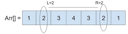 如下圖所示,我們有一個元素陣列,L 是作為 2 的左值,R 是作為 2 的右值。現在,此程式必須找到它們之間的範圍的乘積。