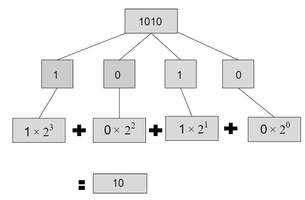 下面是將二進位制數轉換成十進位制數的圖片表示。