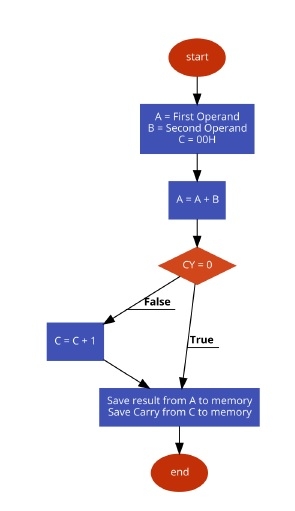 為了執行此任務,我們使用8085微處理器的ADD操作。當加法的結果為1位元組時,進位標誌不會啟用。當結果超過1位元組範圍時,進位標誌將為1。