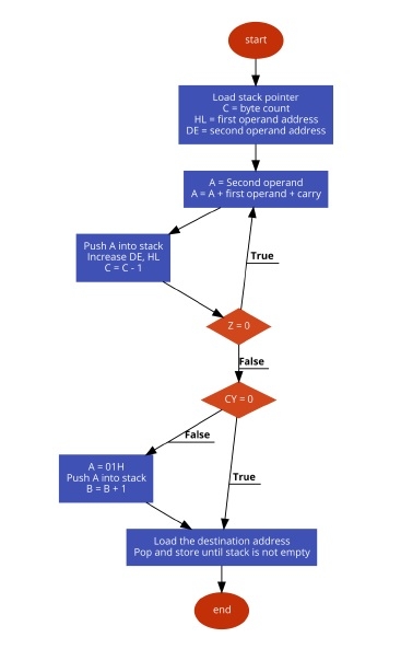 HL對儲存第一個運算元位元組的地址,DE儲存第二個運算元位元組的地址。C儲存位元組計數。我們使用堆疊來儲存結果的中間位元組。完成加法運算後,我們從堆疊中彈出並存儲到目標位置。