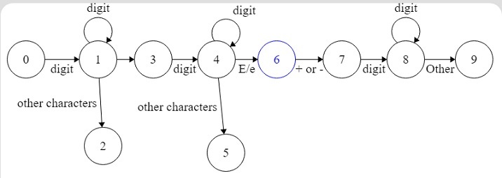 從第4個狀態,如果我們得到其他字元以接受數字,我們可以移動到第5個狀態;如果我們得到E/e,則可以移動到第5個狀態。