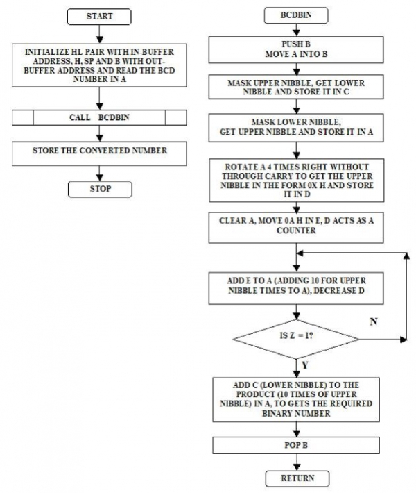 在這個問題中,我們從記憶體中獲取一個 BCD 數並將其轉換為其二進位制等效值。首先,我們將輸入的每個 nibble 切割。因此,如果輸入是 52(0101 0010),那麼我們可以透過將數字與 0FH 和 F0H 進行掩碼來簡單地將其切割。當高位 nibble 被切割時,將其向左旋轉四次以將其傳輸到低位 nibble。