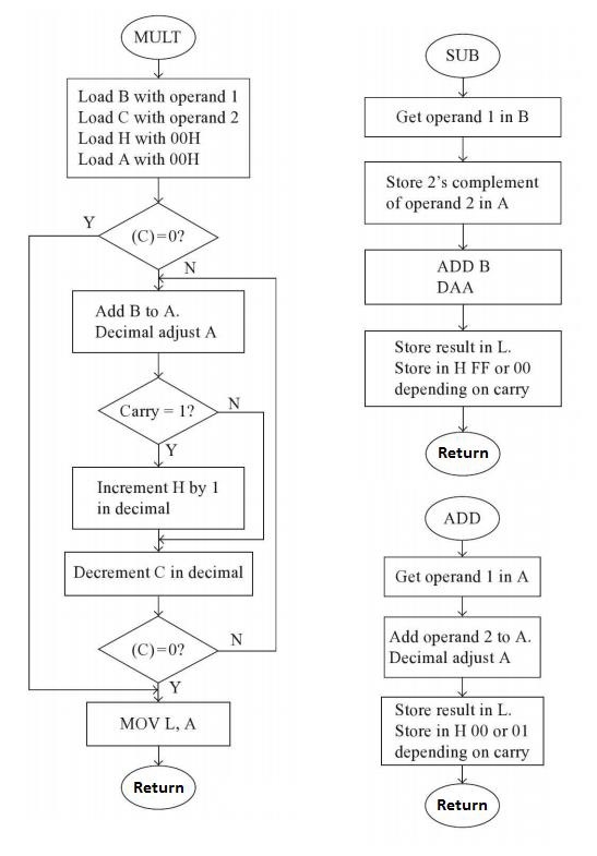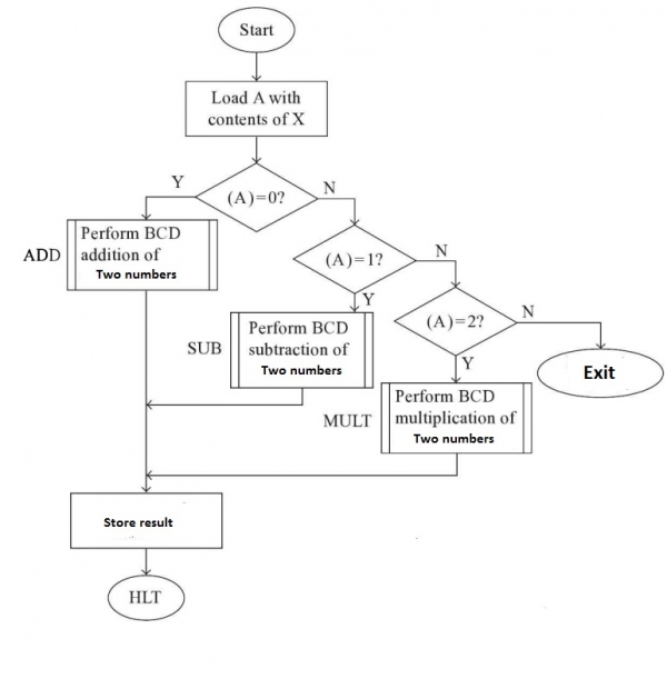 在這個程式中,我們進行選擇。選擇值儲存在記憶體位置8000H(命名為X)。BCD數儲存在位置8001H和8002H。我們將結果儲存在位置8050H和8051H。