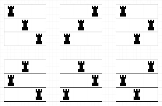 假設我們有一個數字n,表示一個n x n大小的棋盤。我們需要找到放置n個車馬的方案數,使得它們彼此之間不能互相攻擊。如果在一種方案中,棋盤上的某個格子被佔用,而在另一種方案中,該格子未被佔用,則這兩種方案被認為是不同的。(我們知道,如果車馬在同一行或同一列,則它們可以互相攻擊)。