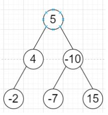 TreeNode *root = new TreeNode(5); root->left = new TreeNode(4); root->right = new TreeNode(-10); root->left->right = new TreeNode(-2); root->right->left = new TreeNode(-7); root->right->right = new TreeNode(15);