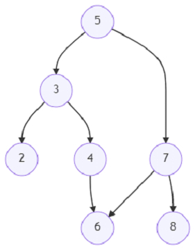 root = make_tree([5, 3, 7, 2, 4, 6, 8]) link_from = search_node(root, 4) link_to = search_node(root, 6) link_from.right = link_to