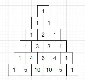 帕斯卡三角形的性質是前一行的兩個相鄰數字的和是位於第二行正下方的數字的值。例如,行 6 中的第一個 10 是行 5 中的 4 和 6 的和,而第二個 10 是行 5 中的 6 和 4 兩個數字的和。
