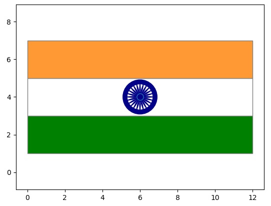 import numpy as np import matplotlib.pyplot as py import matplotlib.patches as patch #Plotting the tri colours in national flag a = patch.Rectangle((0,1), width=12, height=2, facecolor='green', edgecolor='grey') b = patch.Rectangle((0,3), width=12, height=2, facecolor='white', edgecolor='grey') c = patch.Rectangle((0,5), width=12, height=2, facecolor='#FF9933', edgecolor='grey') m,n = py.subplots() n.add_patch(a) n.add_patch(b) n.add_patch(c) #AshokChakra Circle radius=0.8 py.plot(6,4, marker = 'o', markerfacecolor = '#000088ff', markersize = 9.5) chakra = py.Circle((6, 4), radius, color='#000088ff', fill=False, linewidth=7) n.add_artist(chakra) #24 spokes in AshokChakra for i in range(0,24): p = 6 + radius/2 * np.cos(np.pi*i/12 + np.pi/48) q = 6 + radius/2 * np.cos(np.pi*i/12 - np.pi/48) r = 4 + radius/2 * np.sin(np.pi*i/12 + np.pi/48) s = 4 + radius/2 * np.sin(np.pi*i/12 - np.pi/48) t = 6 + radius * np.cos(np.pi*i/12) u = 4 + radius * np.sin(np.pi*i/12) n.add_patch(patch.Polygon([[6,4], [p,r], [t,u],[q,s]], fill=True, closed=True, color='#000088ff')) py.axis('equal') py.show()