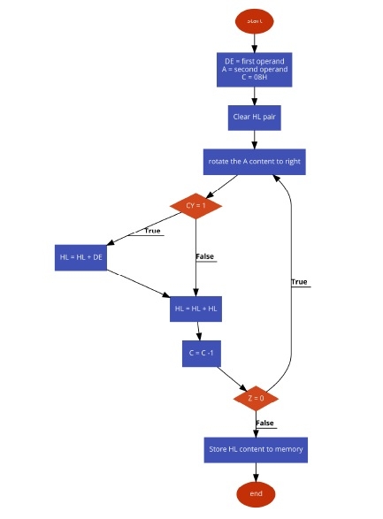 在這個方法中,我們將第一個數字放入DE暫存器對中。實際數字放在E暫存器中,D暫存器保持00H。第二個數字被放入A暫存器中。由於數字是8位數,因此我們將累加器內容移位八次。當旋轉時進位標誌被設定時,DE的內容將與HL相加。最初HL對將保持0000H。然後HL也與其自身相加。這樣就生成了結果。