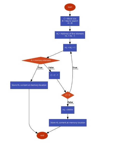 假設資料儲存在8002H到8007H位置。8000H包含塊的大小,8001H儲存要搜尋的關鍵值。當我們執行程式時,它將返回找到項的資料地址,並將地址儲存在9000H和9001H位置。如果找不到該項,則返回FFFFH。