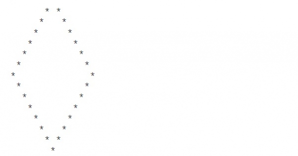 #include <iostream> using namespace std; int main() { int n, i, j, mid; cout << "Enter number of lines: "; cin >> n; if(n %2 == 1) { //when n is odd, increase it by 1 to make it even n++; } mid = (n/2); for(i = 1; i<= mid; i++) { for(j = 1; j<=(mid-i); j++) { //print the blank spaces before star cout << " "; } if(i == 1) { cout << "*"; }else{ cout << "*"; //in each line star at start and end position for(j = 1; j<=2*i-3; j++) { //print space to make hollow cout << " "; } cout << "*"; } cout << endl; } for(i = mid+1; i<n; i++) { for(j = 1; j<=i-mid; j++) { //print the blank spaces before star cout << " "; } if(i == n-1) { cout << "*"; }else{ cout << "*"; //in each line star at start and end position for(j = 1; j<=2*(n - i)-3; j++) { //print space to make hollow cout << " "; } cout << "*"; } cout << endl; } }