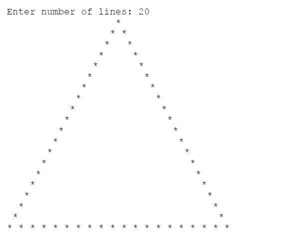 #include <iostream> using namespace std; int main() { int n, i, j; cout << "Enter number of lines: "; cin >> n; for(i = 1; i<=n; i++) { for(j = 1; j<=(n-i); j++) { //print the blank spaces before star cout << " "; } if(i == 1 || i == n) { //for the first and last line, print the stars continuously for(j = 1; j<=i; j++) { cout << "* "; } }else{ cout << "*"; //in each line star at start and end position for(j = 1; j<=2*i-3; j++) { //print space to make hollow cout << " "; } cout << "*"; } cout << endl; } }