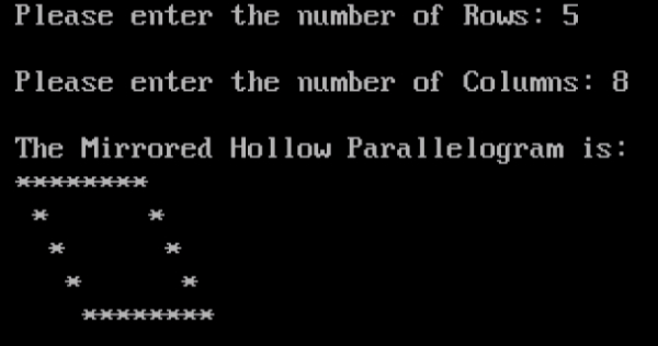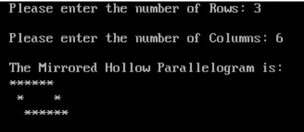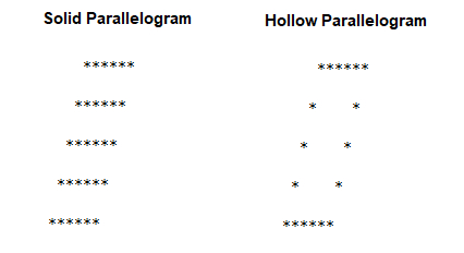- 列印星號以形成空心平行四邊形,執行另一個內迴圈,迴圈結構類似於`for(c=1; c<=cols; c++)`。在此迴圈內,僅當`r==1`或`r==rows`或`c==1`或`c==cols`時才打印星號。