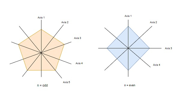 - 如果n是奇數,每個翻轉軸都只穿過一個頂點和相對邊的中點。