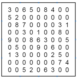 {3, 0, 6, 5, 0, 8, 4, 0, 0}, {5, 2, 0, 0, 0, 0, 0, 0, 0}, {0, 8, 7, 0, 0, 0, 0, 3, 1}, {0, 0, 3, 0, 1, 0, 0, 8, 0}, {9, 0, 0, 8, 6, 3, 0, 0, 5}, {0, 5, 0, 0, 9, 0, 6, 0, 0}, {1, 3, 0, 0, 0, 0, 2, 5, 0}, {0, 0, 0, 0, 0, 0, 0, 7, 4}, {0, 0, 5, 2, 0, 6, 3, 0, 0}