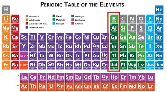 13族也稱為硼族,因為硼是該族的第一種元素。它有6個化學成員。該族的其他成員是鋁 (Al)、鎵 (Ga)、銦 (In) 和鉈 (Tl) (embibe, 2022)。它們都有一個共同點:它們的原子核結構外層都有三個電子。如果劑量過高,該族的所有成員都被認為是有毒的。