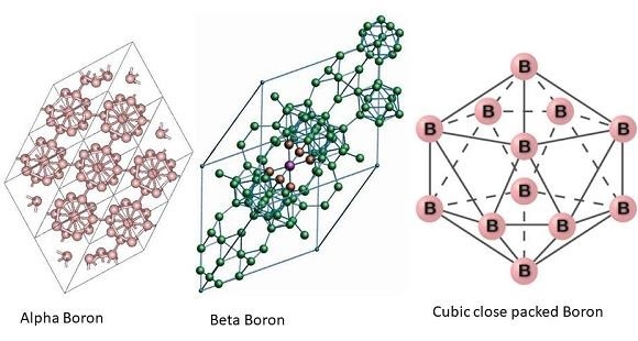 (維基百科英文版材料科學家,α-硼,CC BY-SA 3.0)(維基百科英文版材料科學家,β-硼,CC BY-SA 3.0)(OpenStax,CNX Chem 18 03 BIcosahed,CC BY 4.0)