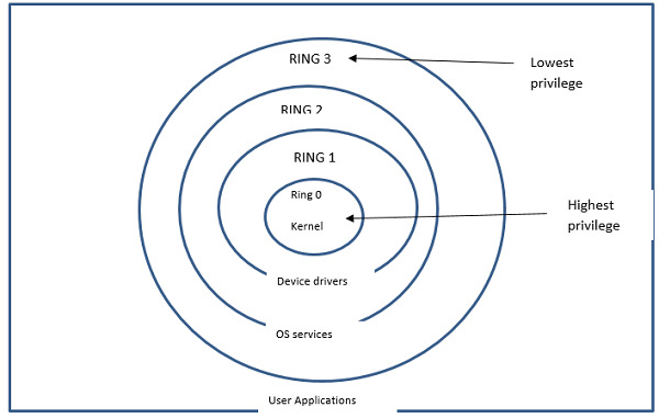 作業系統在不同的層級上執行,並且每個層級都有其特權。這些特權使用保護環來表示,用於共享資源和硬體系統,這些系統管理儲存在計算機系統中的資源,例如 CPU 處理時間和記憶體訪問時間。保護環按從最可信到最不可信特權的層次順序排列。位於核心級別的中心環可以訪問所有資源,並具有最高特權,而後續層級則具有較低的訪問許可權級別。此機制是由 CPU 架構在不同訪問模式下硬體強制執行的。具有 x86 的處理器使用四個級別的環,使用環 0 到環 3 實現,其中環 0 具有最高特權。