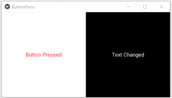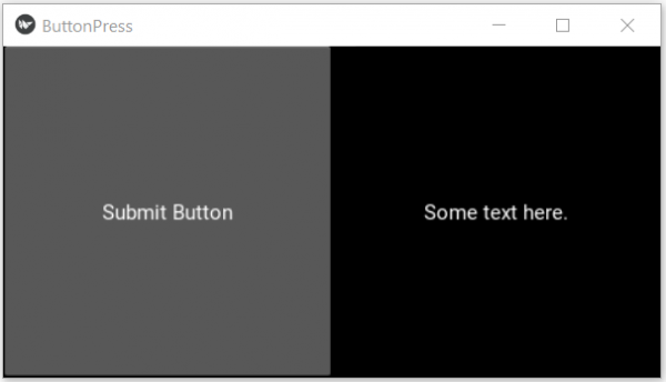 from kivy.app import App from kivy.uix.label import Label from kivy.uix.button import Button from kivy.uix.boxlayout import BoxLayout class ButtonPressApp(App): def __init__(self): super(ButtonPressApp, self).__init__() self.btn = Button(text='Submit Button') self.lbl = Label(text='Some text here.') def build(self): self.btn.bind(on_press=self.click_event) layout = BoxLayout() layout.orientation = 'horizontal' layout.add_widget(self.btn) layout.add_widget(self.lbl) return layout def click_event(self, obj): self.btn.background_normal='' self.btn.color=(1,0,0,0.8) self.btn.text = 'Button Pressed' self.lbl.text = 'Text Changed' MainLayout = ButtonPressApp() MainLayout.run()