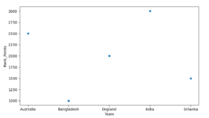 data = [["Australia", 2500],["Bangladesh", 1000],["England", 2000],["India", 3000],["Srilanka", 1500]] dataFrame = pd.DataFrame(data, columns=["Team","Rank_Points"])