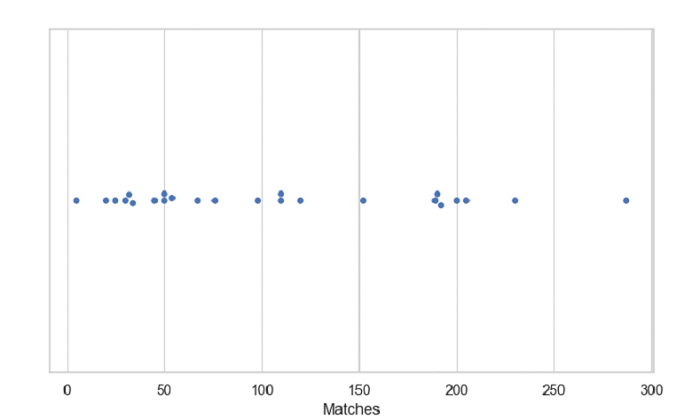 import seaborn as sb import pandas as pd import matplotlib.pyplot as plt # Load data from a CSV file into a Pandas DataFrame dataFrame = pd.read_csv("C:\Users\amit_\Desktop\Cricketers2.csv") # setting theme sb.set_theme(style="whitegrid") # plotting swarm plot with Matches sb.swarmplot(x = dataFrame["Matches"]) # display plt.show()
