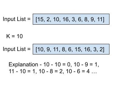 為了解決給定的問題,我們將使用 abs 函式,該函式將用於計算 K 與列表專案之間的絕對差值。因此,透過使用此差值,我們將對給定的列表進行排序,這就是所需的結果。