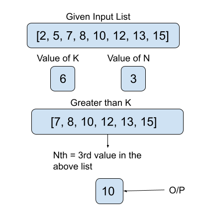 問題是要使用 Python 查詢大於數字 K 的第 N 小數。基本上,我們需要找到一個大於 K 的數字,並且它是排序列表中從數字 K 開始的第 N 個數字。例如,我們將藉助下圖來理解這種現象: