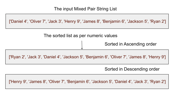 手頭的問題是在給定的字串列表中對混合對中的數字進行排序。因此,我們將得到一個列表,其中包含混合的資料型別,如字串和整數。因此,我們必須根據特定元素中的數字值對它們進行排序。例如,讓我們檢視下圖以更清楚地瞭解 -