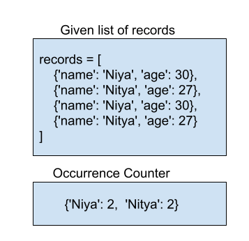 統計給定記錄列表中元素的出現次數,將透過遍歷每個記錄來完成,在迴圈內部,我們將檢查所需的值或項。然後,我們將維護一個字典來儲存迭代過程中不同項或值的計數。如果我們找到所需的值,我們將更新建立的字典中的計數。