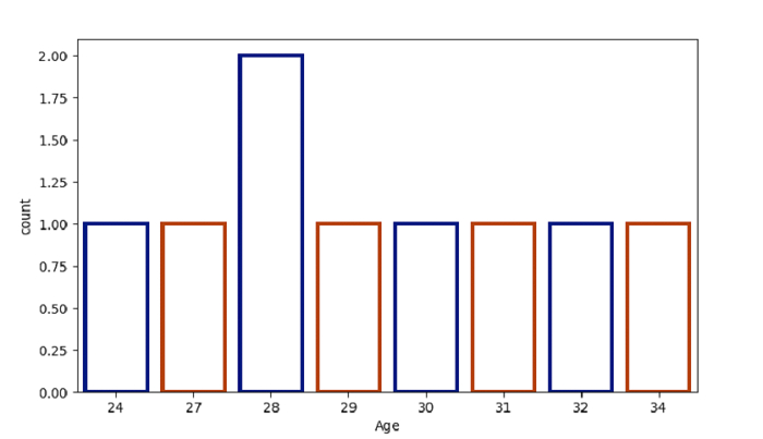 sb.countplot(dataFrame["Age"], facecolor=(0, 0.0, 0, 0),linewidth=3,edgecolor=sb.color_palette("dark", 2))示例
