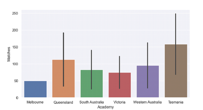 sb.barplot(x = "Academy", y = "Matches",data = dataFrame, ci = "sd")