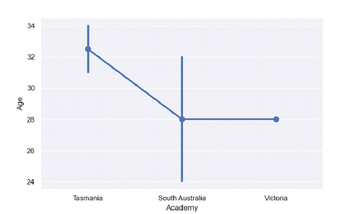 sb.pointplot( x = 'Academy',y = 'Age', data = dataFrame, order=["Tasmania", "South Australia", "Victoria"] )