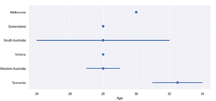 dataFrame = pd.read_csv("C:\Users\amit_\Desktop\Cricketers.csv")現在,繪製水平點圖。“join”引數設定為False以避免繪製連線點的線: