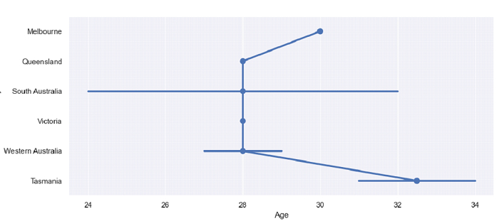 水平點圖是基於x和y的值進行繪製的,即您考慮的資料集的列。Seaborn中的點圖用於使用散點圖符號顯示點估計和置信區間。seaborn.pointplot() 用於此目的。