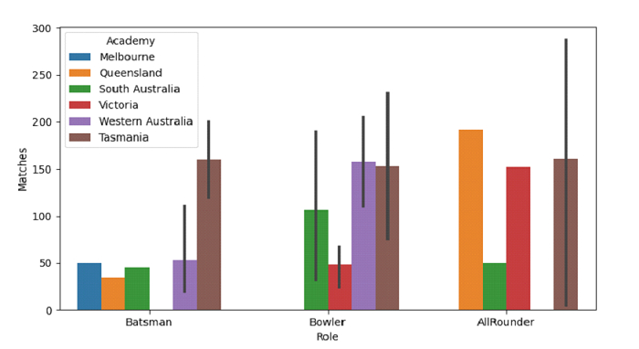 import seaborn as sb import pandas as pd import matplotlib.pyplot as plt # Load data from a CSV file into a Pandas DataFrame dataFrame = pd.read_csv("C:\Users\amit_\Desktop\Cricketers2.csv") # plotting vertical bar plots grouped by two categorical variables # hue parameter also set sb.barplot(x = dataFrame["Role"], y = dataFrame["Matches"], hue = "Academy", data= dataFrame) # display plt.show()