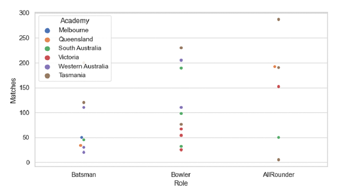 sb.swarmplot(x = "Role", y = "Matches", hue = "Academy", data = dataFrame)