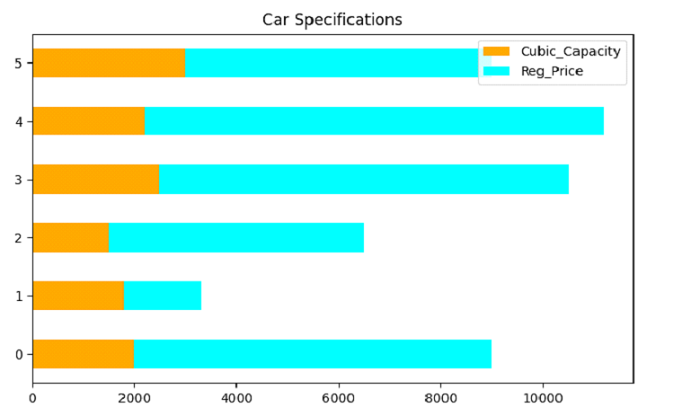 dataFrame.plot.barh(stacked=True, title='Car Specifications', color=("orange", "cyan"))