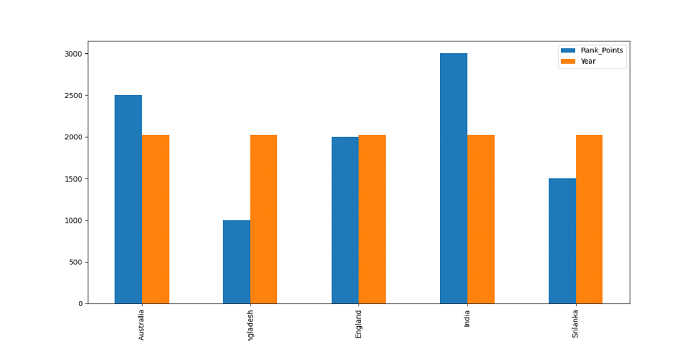 import pandas as pd import matplotlib.pyplot as mp # our data data = [["Australia", 2500, 2021],["Bangladesh", 1000, 2021],["England", 2000, 2021],["India", 3000, 2021],["Srilanka", 1500, 2021]] # dataframe dataFrame = pd.DataFrame(data, columns=["Team","Rank_Points", "Year"]) # plotting multiple columns in a bar Graph dataFrame.plot(x="Team", y=["Rank_Points","Year" ], kind="bar", figsize=(10, 9)) # displaying bar graph mp.show()