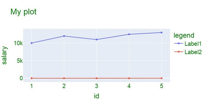 import plotly.graph_objs as go fig = go.Figure() data = { 'id':[1,2,3,4,5], 'salary':[10000,12000,11000,12500,13000], 'Age':[21,22,23,24,25] } fig.add_trace(go.Scatter( x=data['id'], y=data['salary'], name="Label1") ) fig.add_trace(go.Scatter( x=data['id'], y=data['Age'], name="Label2") ) fig.update_layout( title="My plot", xaxis_title="id", yaxis_title="salary", legend_title="legend", font=dict( family="Arial", size=20, color="green" ) ) fig.show()