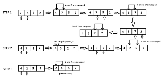 如果當前元素大於陣列的下一個元素,則交換它們。