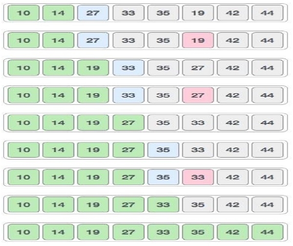 在選擇排序的每次迭代過程中,最小元素從未排序子陣列中彈出並插入到已排序子陣列中。