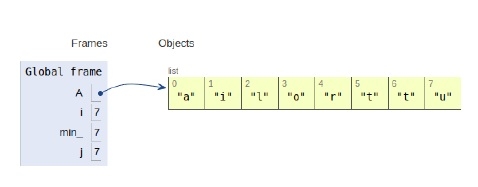 A = ['t','u','t','o','r','i','a','l'] for i in range(len(A)): min_= i for j in range(i+1, len(A)): if A[min_] > A[j]: min_ = j #swap A[i], A[min_] = A[min_], A[i] # main for i in range(len(A)): print(A[i])