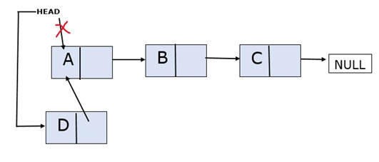 考慮一個包含3個節點A、B和C的連結串列。新節點D要新增到開頭。